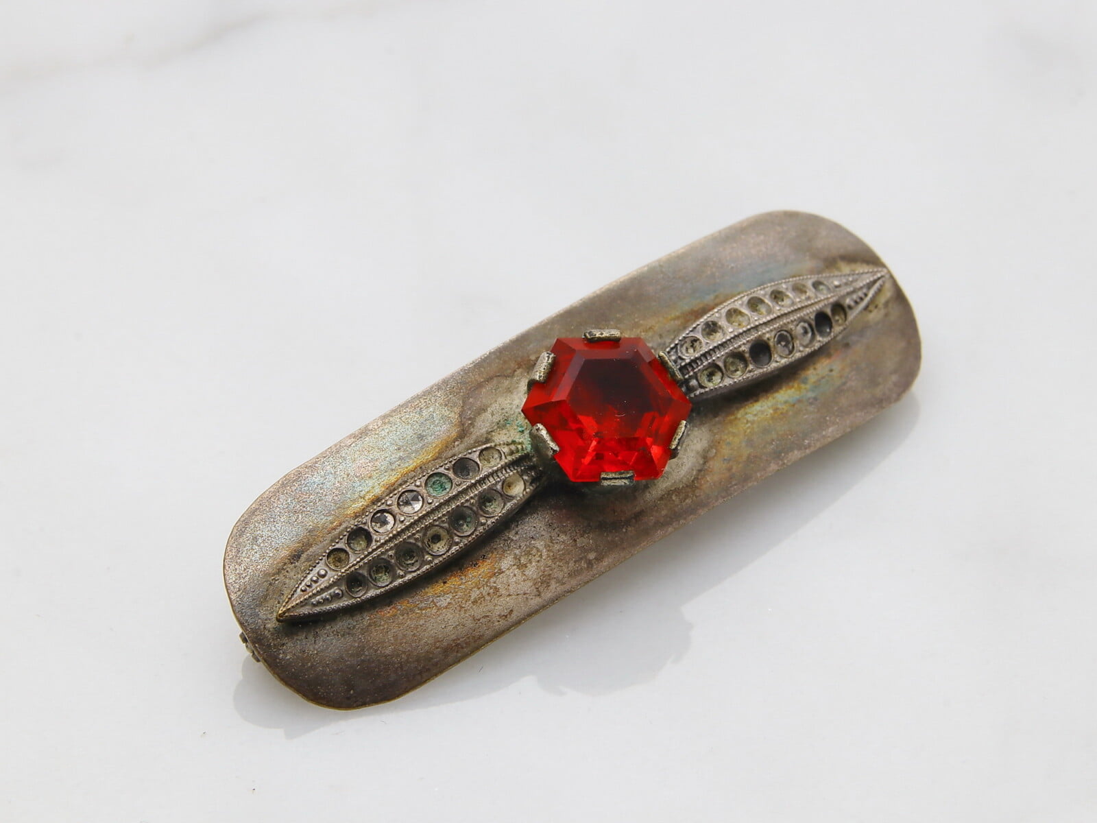 | Opis snovi | Nedragocena kovina srebrne barve Steklo s srebrnim nanosom Rdeč steklen kamen |