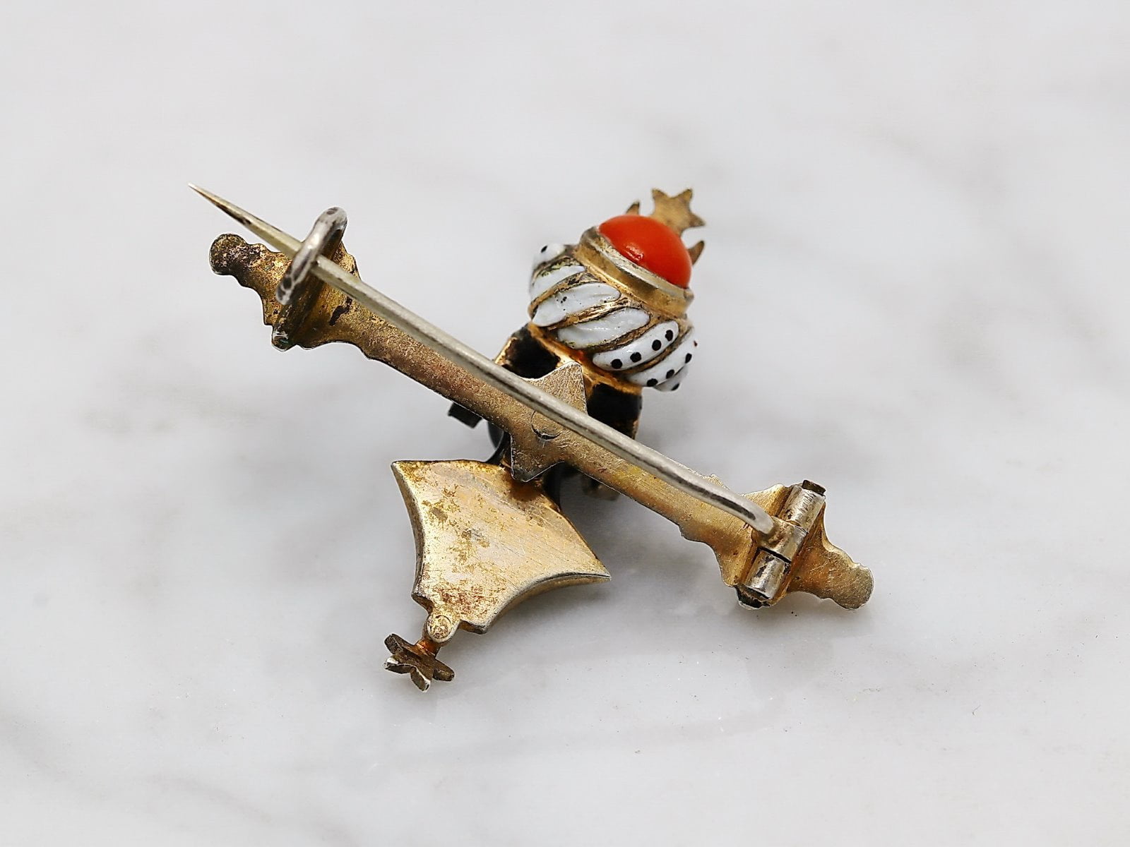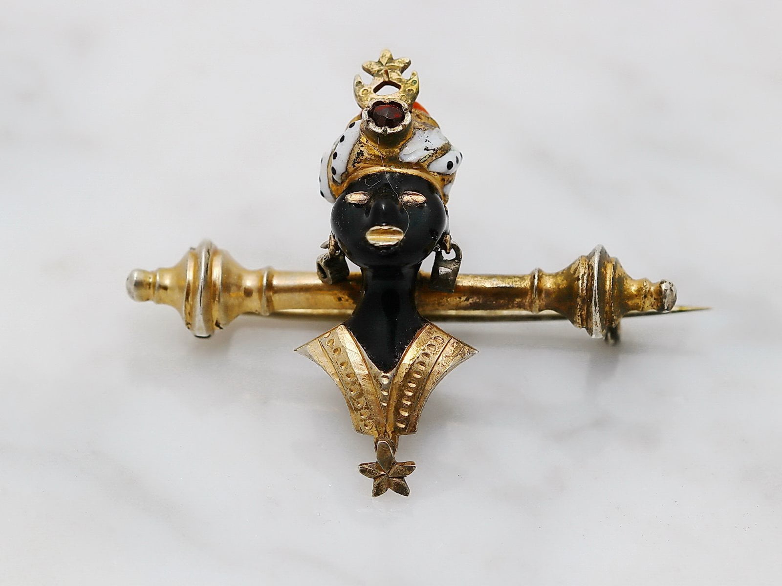 | Opis snovi | Pozlačeno srebro čistine 750/1000 Črn in bel emajl Rdeča korala Rdeč kamenček na turbanu |