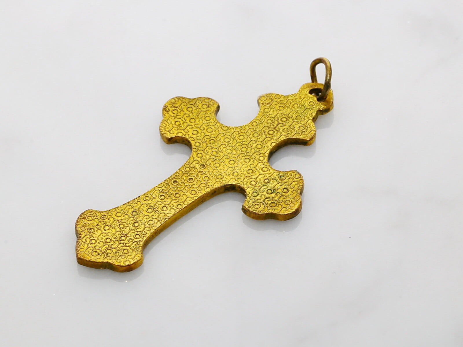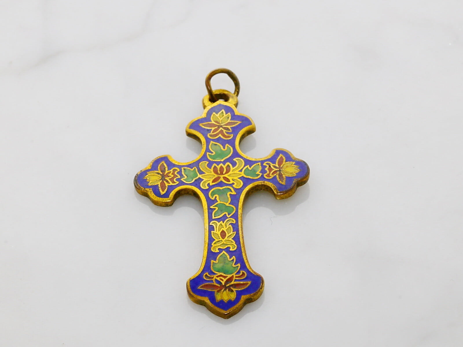 | Opombe, zgodovina | Križ je darilo g. O.B. muzeju. Je neobičajna kombinacija (pogojno) verskega, in barvitega dekorativnega nakita, ter kombinacija cenenega materiala in zahtevne tehnike celičnega nanosa emajla. Celični emajl je zlatarska tehnika, kjer kratke , tanke žičke iz zlata, srebra ali drugih kovin, varijo na podlago v željenih vzorcih in oblikah. Nastanejo zaključene celice (cloisoni), katere polnijo s emajlom v prahu različnih barv. Vsako barvo je potrebno nanašati in toplotno obdelati posebej. Na koncu ev. vršičke kovine in emajl brusijo v gladko površino. |