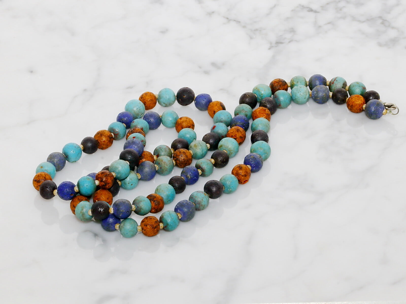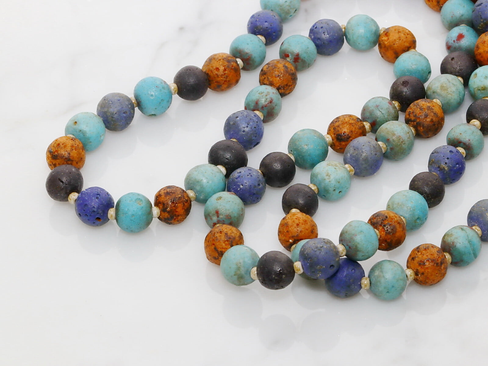 Bombažna nit, vozlana med koraldami. Danes laks z vmesnimi steklenimi koraldami