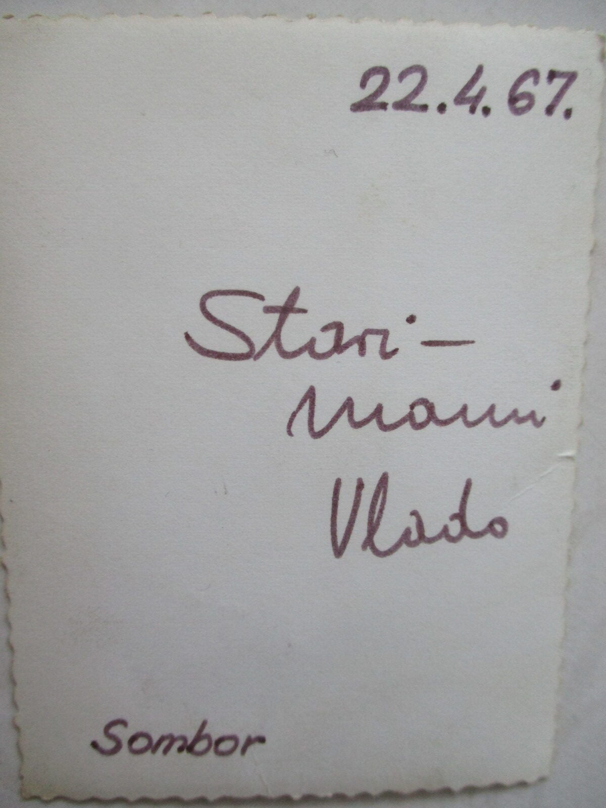| Opombe | Fotografijo, posneto pri neznanemu fotografu v Somboru, je Vlado v času prestajanja obveznega vojaškega služenja v Jugoslovanski narodni armiji poslal svoji stari mami Mariji v Ljubljano |