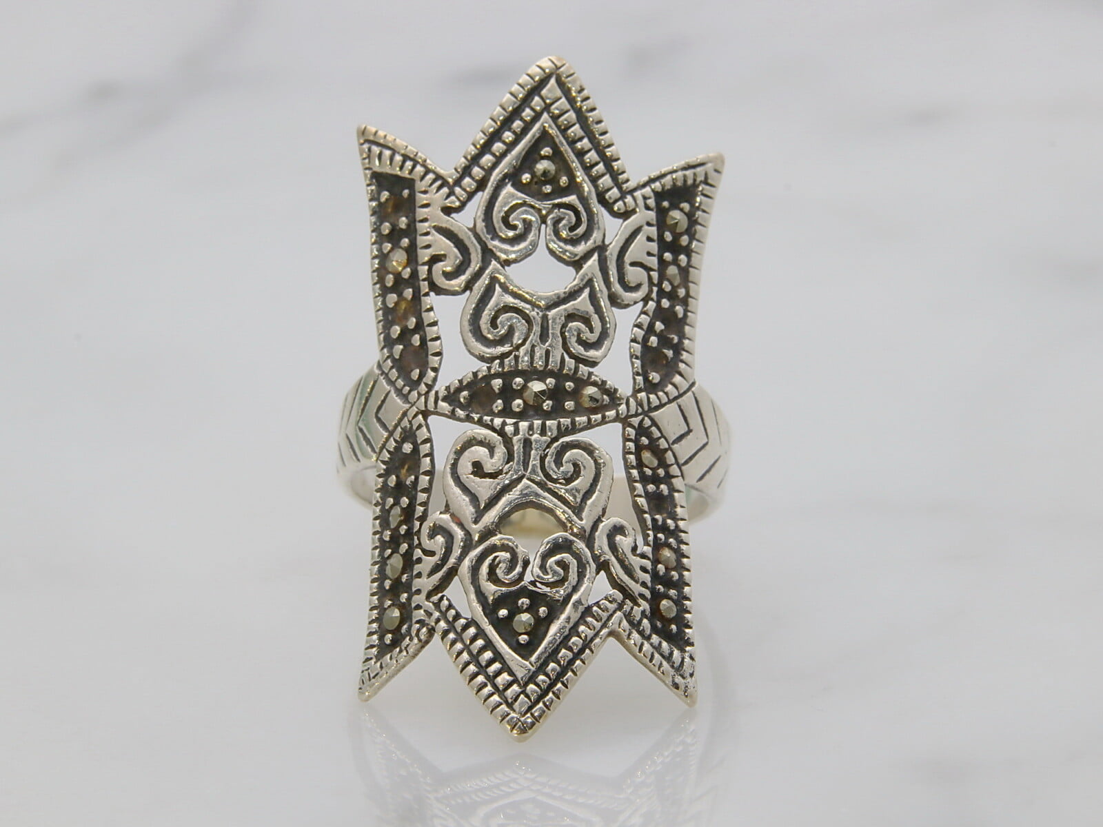 | Opombe, zgodovina | Prstan je turistični spominek iz potovanja po Maroku. S tako veliko okrasno ploščico je bil izbran namenoma. Ste morda v neki knjigi srečali stavek ” in neko jutro sem se zbudila z rokami svoje matere ” ? To se namreč z leti in desetletji res zgodi, koža se naguba, členki postajajo grčasti in veliki, drobni prstani pa se v tem izgubijo in postanejo nelepi, izgledajo naivno, celo otroško. Velik prstan pa uspe del tega pokriti in izravnati, predvsem pa preusmeriti pozornost iz rok. |